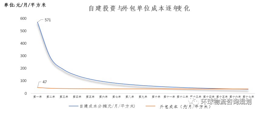 我们用一个简化的数据来说明这个例子的比较方法。如图中,我们只摘取仓库建设成本来看,蓝色为“自建仓储”的成本,并将其分摊到(元/月/平方米),橙色为外包物流成本,单位也同前者。然后根据时间线,测算出每年自建成本与外包成本。当在未来16年后自建物流成本的单价才能低于外包物流成本。