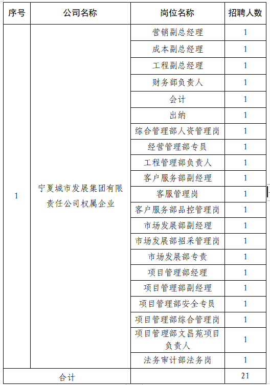 为进一步加强宁夏城市发展集团有限责任公司(以下简称“公司”)人才队伍建设,招聘专业化优秀人才,优化人才队伍结构,打造一支业务精、能力强、素质高、作风硬的人才队伍,满足公司用人需求,现面向社会公开招聘权属企业工作人员21名。现将有关事宜公告如下: