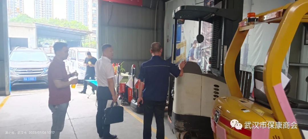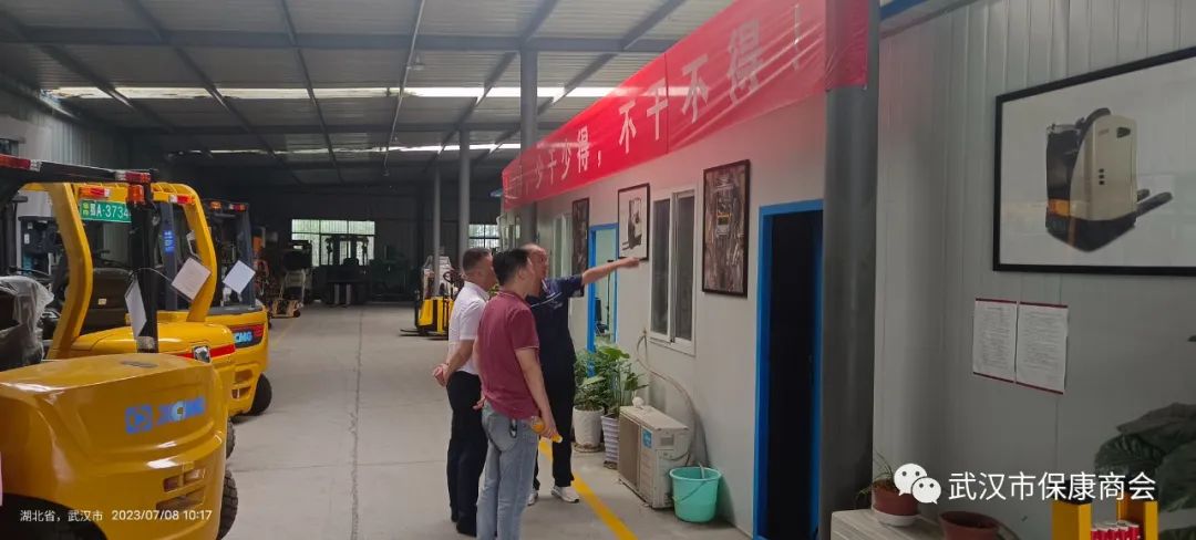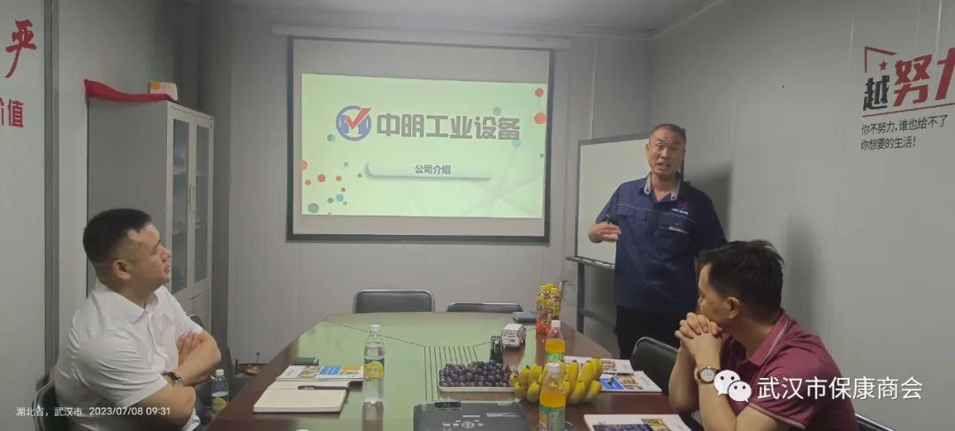 2023年7月8日,在会长刘建的带领下,三人小组冒雨来到监事长彭宗明的武汉中明工业设备有限公司,对公司进行走访交流。首先由彭总带领大家参观了该司分部办公点。