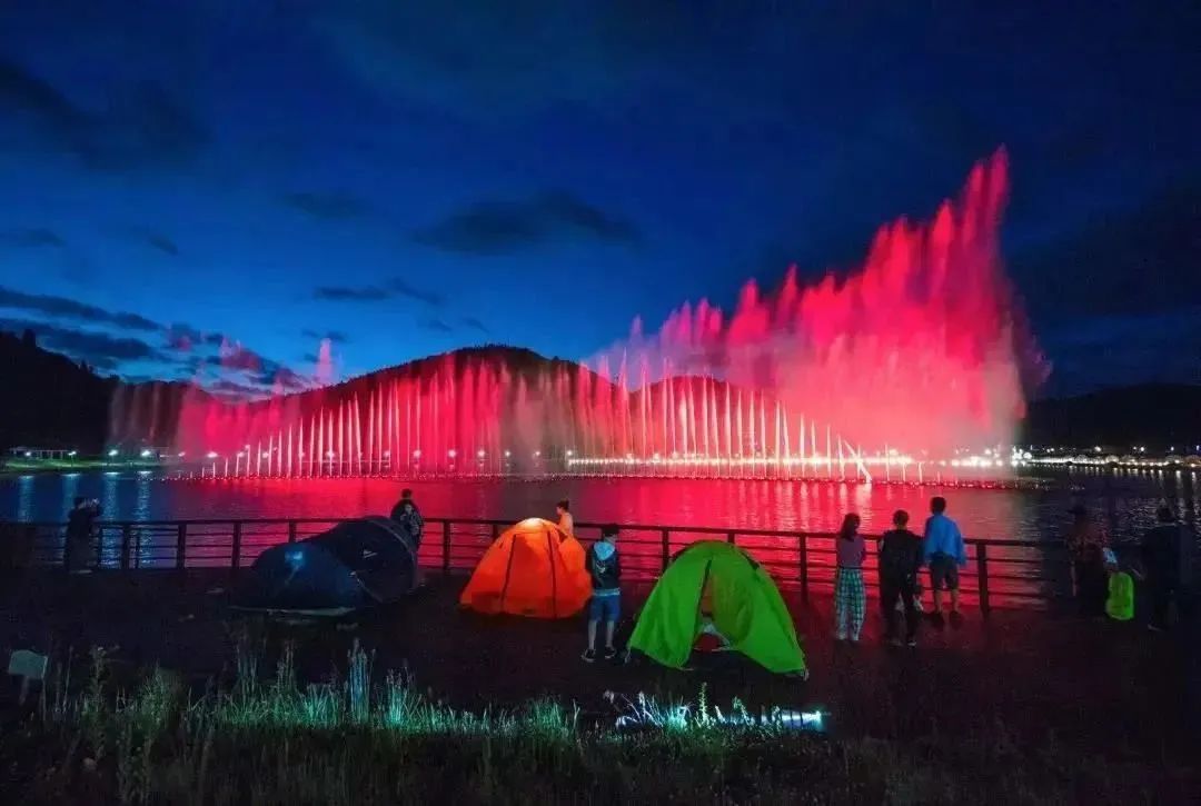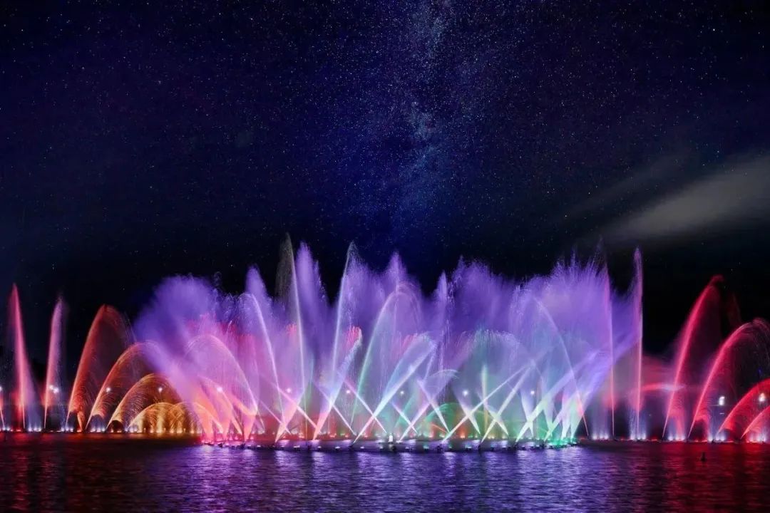 在湖光山色 ,灯光水影中,伴随音乐的变幻,水柱时而呈跳圈式,时而呈弧线形,时而多种单体水型组合变换,一步一景,皆是画卷。
