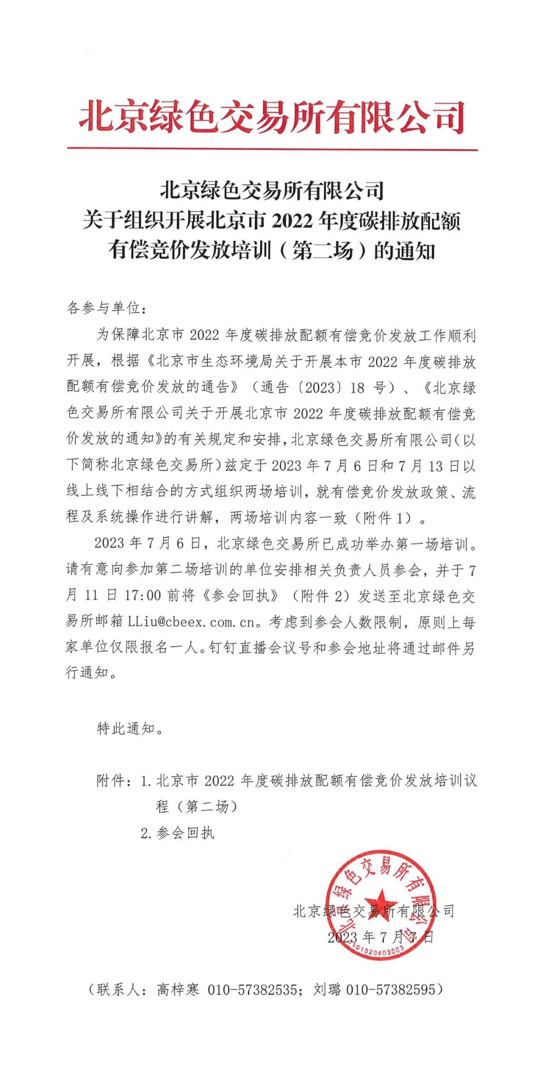 为保障北京市2022年度碳排放配额有偿竞价发放工作顺利开展,根据《北京市生态环境局关于开展本市2022年度碳排放配额有偿竞价发放的通告》(通告〔2023〕18号)、《北京绿色交易所有限公司关于开展北京市2022年度碳排放配额有偿竞价发放的通知》的有关规定和安排,北京绿色交易所有限公司(以下简称北京绿色交易所)兹定于2023年7月6日和7月13日以线上线下相结合的方式组织两场培训,就有偿竞价发放政策、流程及系统操作进行讲解,两场培训内容一致(附件1)。