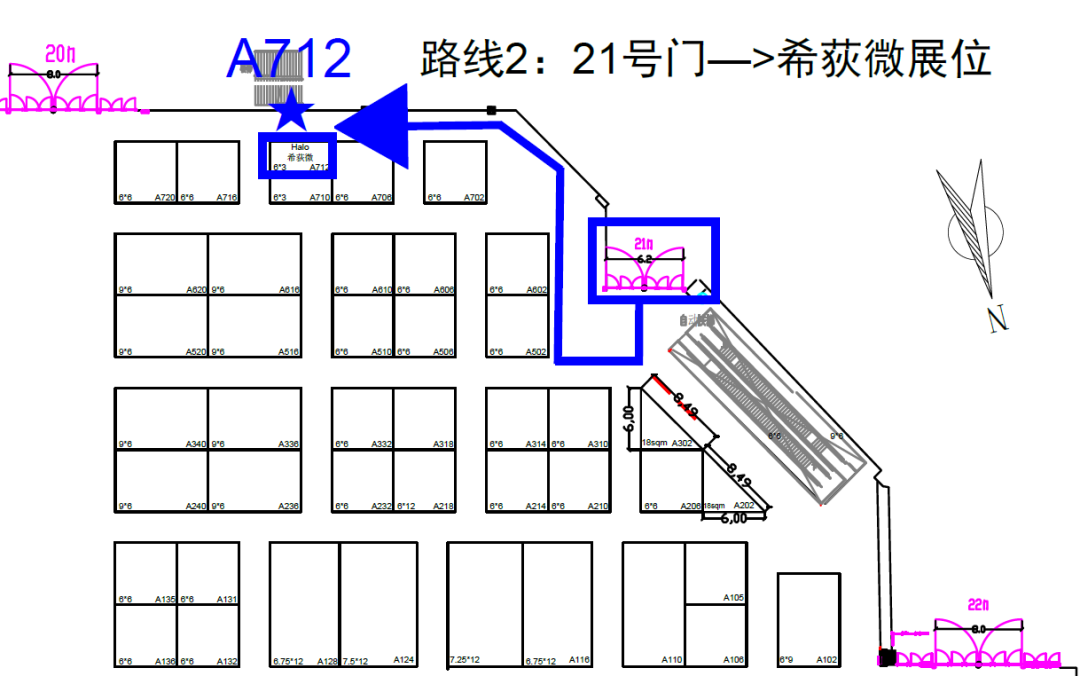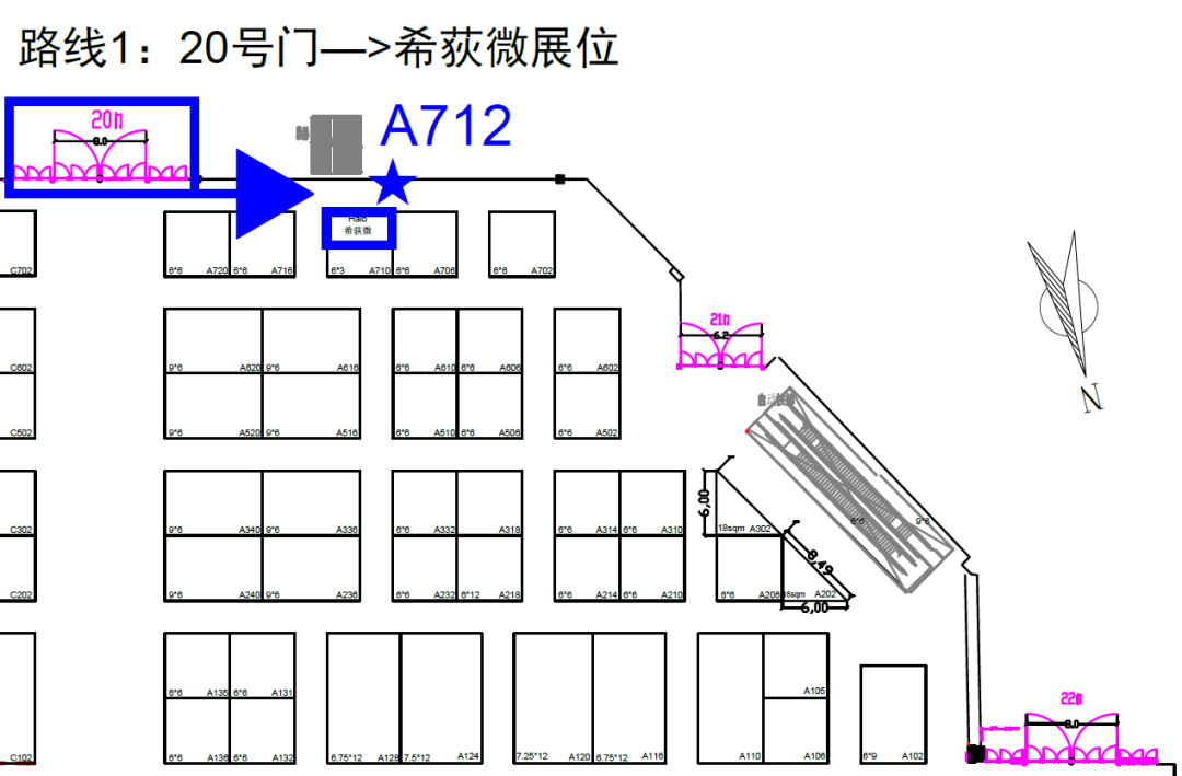 从22号门进来,往右后方走,期间会经过21号门,继续往前走,走到走廊尽头,往左边走,走过两个展位,希荻微的展位就在第三个展位的位置。很容易识别,展位号码为A712。