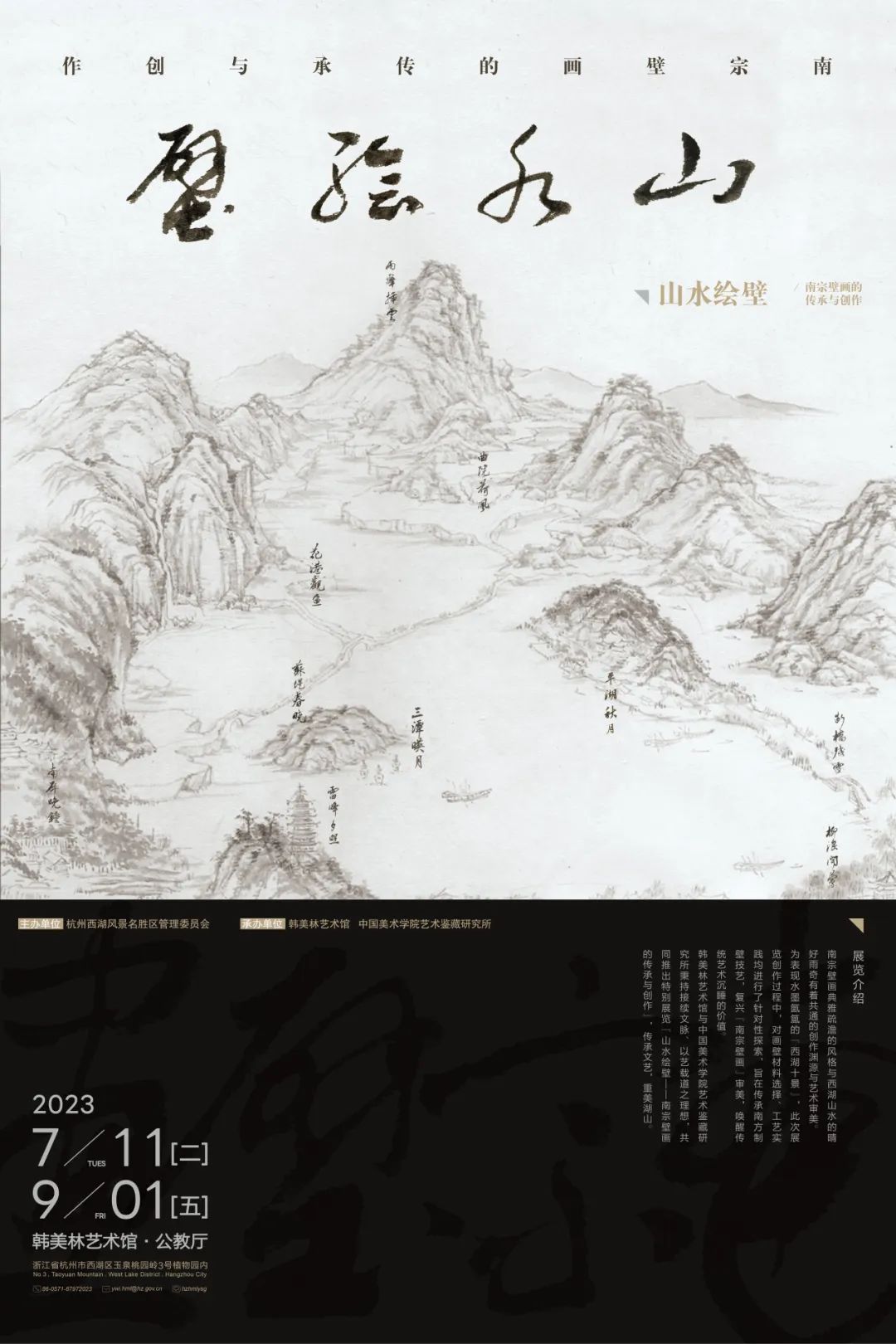 “山水绘壁——南宗壁画的传承与创作”展为表现水墨氤氲的“西湖十景”,对画壁的材料选择、工艺实践均进行了针对性的探索,旨在接续道玄文脉,传承南方制壁技艺,复兴“南宗壁画”审美,唤醒传统艺术沉睡的价值。