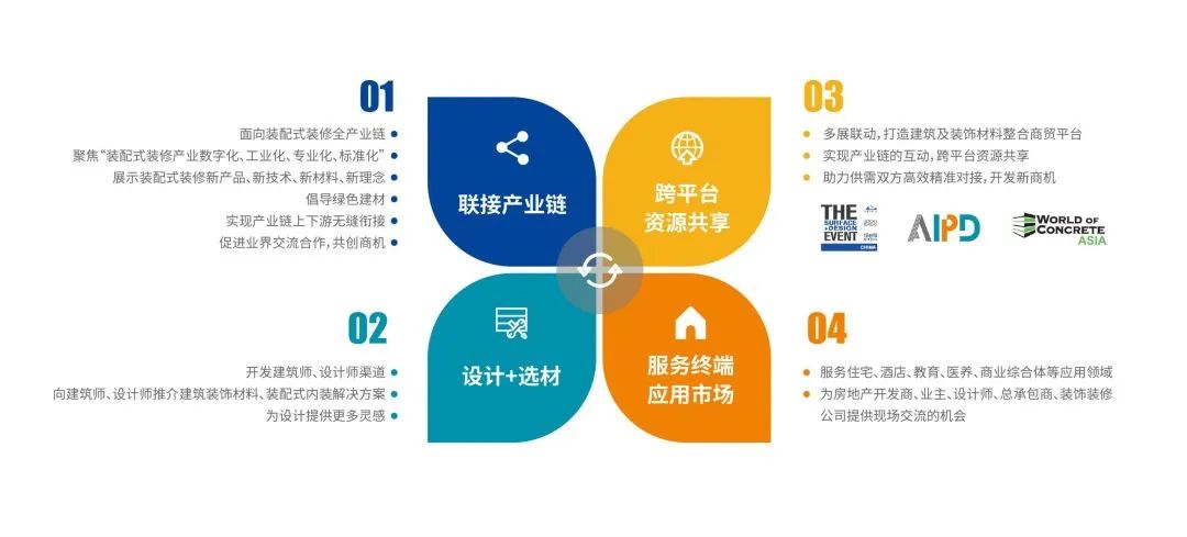 亚洲装配式内装产业展览会(AIPD)立足于中国市场,辐射亚太地区。探索推进“装配式装修产业数字化、工业化、专业化,推动装配式装修产业进程,促进产业绿色可持续发展,覆盖科技研发、设计、生产加工、施工装配、装备制造、标准化等装配式装修全产业链,展示新技术、新材料、新工艺、新设备,打造全装修与装配式装修行业的国际性交流洽谈及采购商贸平台。“SURFACES China上海国际地面墙面材料、铺装及设计展览会”及“WOCA亚洲混凝土世界博览会”将同期举办,三展联动,充分发挥协同效应,打造集“建筑装饰材料、表面铺装材料、装配式装修、建筑及室内设计”于一体的整合建筑装饰材料商贸平台。面向住宅、酒店、教育、医养、商业综合体等应用领域,为房地产开发商、业主、设计师、总承包商、装饰装修公司提供现场交流的机会,助力供需双方拓展业务,发展新商机。