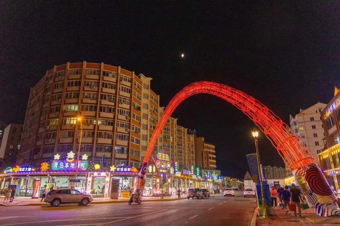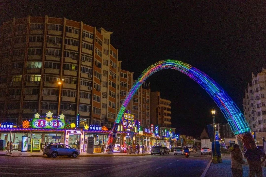 夜幕降临,入口拱门喷射出来的彩虹光条与商家门头灯交相辉映,在夜幕之中闪烁,青岛夜生活在这里被“一键”点亮。