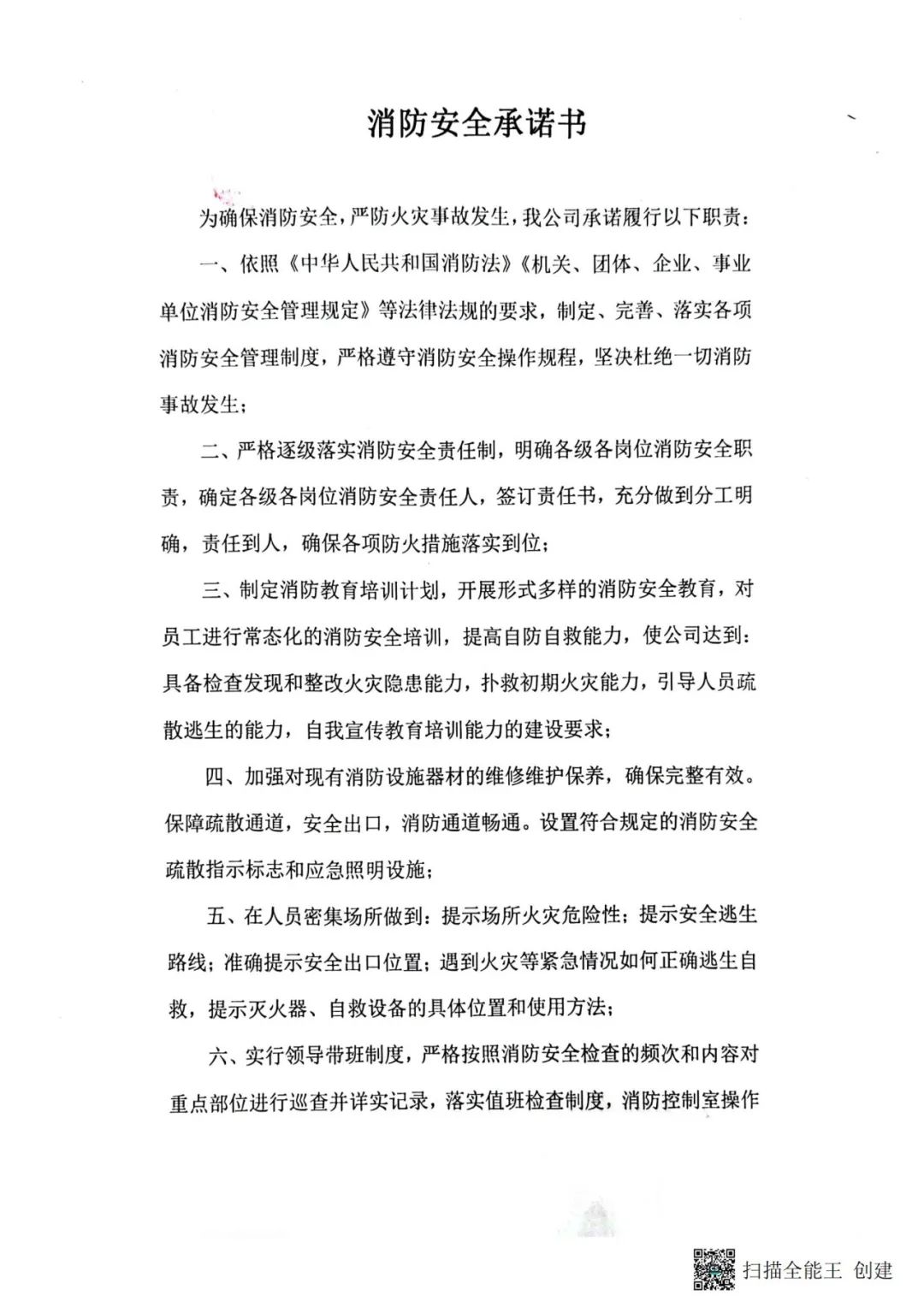 我们郑重公开承诺:我公司自主评估风险,自主安全检查,自主隐患整改,严格落实消防安全主体责任,接受社会各界监督指导!