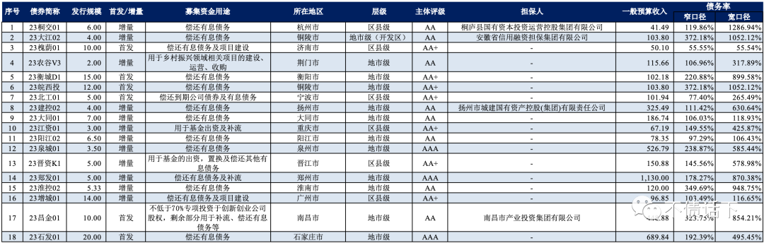 7月3日-7月7日已发的城投债中,共18只为增量发行(即非借新还旧债),其中6只为首发,12只为发债主体增量发行。其募集资金用途、增信措施、所属层级、地区财力等明细见下表:
