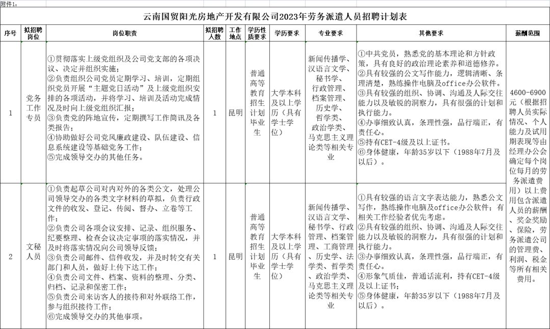 云南国贸阳光房地产开发有限公司系一家全资国有企业,由市属国有企业昆明佳湖房地产开发有限公司全资控股。公司承接股东昆明佳湖房地产开发有限公司20余年的本土房地产开发经验,开发过锦苑花园、佳湖花园、佳湖新城、华都花园、清水佳湖、佳湖熹祥苑等多个高品质舒居住宅项目,在安宁太平新城亦有项目储备。为满足企业可持续发展的人才储备需求,拓宽选人用人渠道,发掘适合公司发展所需的综合性人才,优化人力资源配置,提高公司管理运营效率,计划面向社会招聘劳务派遣人员2人,现公告如下。招聘工作遵循“公平、公正、公开、竞争、择优”的原则。经民主决策程序,坚持德才兼备,按照信息公开、公平公正、笔试与面试相结合、考试进入、择优录取的原则依法依规开展招聘工作。本次计划面向社会公开招聘2个岗位共计2人。具体招聘岗位及要求详见附件1:《云南国贸阳光房地产开发有限公司2023年劳务派遣人员招聘计划表》( 1 ) 遵守中华人民共和国宪法、法律、法规及纪律;( 2 ) 具有良好的社会道德,品行端正,诚实守信;( 4 ) 具备招聘岗位所需的学历、学位和专业要求,能够履行公司员工职责和义务。( 1 ) 曾因违法犯罪受过刑事处罚,或被开除中国共产党党籍的人员、被开除公职的人员;( 2 ) 属于刑事案件被告人、犯罪嫌疑人,司法机关尚未撤销案件、检察机关尚未作出不起诉决定或人民法院尚未宣告无罪的人员;( 3 ) 尚未解除党纪、政务处分或正在接受纪律审查的人员;( 4 ) 在读的非应届毕业生以及在职公务员和参照《中华人民共和国公务员法》管理的机关事业(单位)工作人员;( 5 ) 被有权机关认定存在舞弊等严重违反招考纪律的行为受到处罚,依据国家、省、市相关规定不得录用的人员;采取网上发布招聘公告,线上报名,笔试与面试相结合的方式。在前程无忧招聘网站昆明频道发布招聘公告,公告时间10个工作日。1. 报名时间:2023年7月7日至2023年7月20日17:00时截止。应聘人员在规定的时间内登陆前程无忧网站昆明频道进入本公告页面详细阅读本次公告流程和要求后,点击报名入口进行简历投递。应聘人员须准确完整地填写个人信息,并按要求上传相关报名材料。本次招聘只接受网络报名,恕不接受电话、现场投递或邮寄材料报名。(1)近期免冠证件照1张(格式统一为JPG),身份证、毕业证、学位证、学信网教育部学籍在线验证报告、相应资格证书、职称证书、党员证明材料、CET4证书、所获荣誉证书等有效证件,以及所有可用作证明的自荐材料,如科技成果、论文等。(2)《云南国贸阳光房地产开发有限公司2023年劳务派遣人员招聘报名登记表》(详见附件2)。(3)《云南国贸阳光房地产开发有限公司2023年劳务派遣人员招聘高校毕业生承诺书》仅2023年尚未取得毕业证书的应届毕业生需上传(详见附件3)。应聘者有义务真实、完整填写申报信息并上传相关材料,上传材料应与后续验证的材料原件一致。如因个人原因未按规定格式提供材料、或提供材料不真实、不完整影响应聘结果的,由应聘者本人承担责任。凡因本人填写、提交信息弄虚作假的,一经查实取消选聘资格;已经录用的予以辞退。(1)由前程无忧根据应聘者提供的报名信息及材料,对应聘者的报名资格进行初审。(2)岗位调剂:第一次岗位应聘人数在规定报名期限内达不到最低开考比例的,须进行第二次挂网公告。公告期为10个工作日。第二次挂网公告后,仍达不到最低开考比例的岗位,应削减拟招聘岗位人数,直至达到开考比例。削减拟招聘岗位人数后仍达不到开考比例的,取消该岗位招聘。报考取消岗位的人员,可调剂改报其他符合条件的岗位。(3)如因应聘人员个人信息不正确或通讯工具不畅通造成无法联系上应聘人员的,视为应聘人员放弃本次应聘。资格初审合格的应聘者进入笔试环节,由前程无忧统一发放准考证,考生凭身份证及准考证原件统一参加考试。面向社会公开招聘岗位的笔试开考比例不得低于3:1,即每个岗位的应聘人数与招聘人数之比达3:1以上方可开考。(1)笔试采取闭卷方式进行,笔试时间为120分钟,卷面总分为100分,笔试合格分数线为60分。(2)具体笔试时间及地点以前程无忧短信或电话通知为准。(3)笔试成绩及拟进入面试的人选在前程无忧网站昆明频道上公示,公示时间为3个工作日。面试前需要进行资格复审,拟进入面试人员本人或持委托函的人员,须携带与报名时提交的信息一致的身份证、毕业证、学位证、学信网教育部学籍在线验证报告、党员证明材料、CET4证书、相关资格证书等材料的原件及复印件各一份至指定地点进行现场复审。若资格复审出现证件资料与报名材料不相符的,一律取消面试资格。未在规定时间内参加资格复审的视为主动放弃面试资格。因应聘人员主动放弃或资格复审不合格等原因达不到面试最低比例的,按笔试成绩从高到低依次递补。拟进入面试人员,由第三方人才服务机构提供职业性格测评。职业性格测试不计入综合成绩。通过资格复审的拟进入面试人员方可参加面试。原则上每个岗位进入面试人数与拟招聘人数的比例最低为2:1,最高不超过3:1。若确定进入面试环节笔试成绩最后一名出现并列的,则并列进入面试。未在规定的时间内参加面试的视为主动放弃,面试环节因应聘人员主动放弃等原因达不到面试最低比例的,按笔
