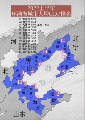 由2022年上半年环渤海人均GDP图可以看出,环渤海内部地区经济发展差异大,辐射弱,龙头城市还未完全带动环渤海地区的经济发展,差异化较为明显。