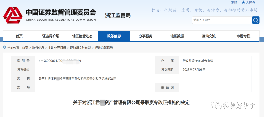 7月6日,浙江证监局对浙江**资产管理有限公司采取责令改正措施的决定。据中基协公示信息来看,目前该私募存续管理规模0~5亿,在职人员显示23人。一起来看下具体情形