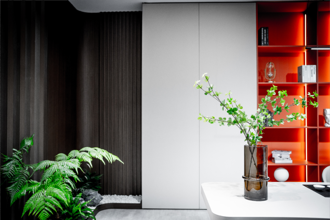 弧形元素的应用对于全屋定制来说,在减少棱角锐感的同时增强了钝感,使整体空间变得更温柔,不仅彰显柜体质感也有放大空间在视觉上的效果。这种工艺技术也成为了现场来宾关注的焦点。