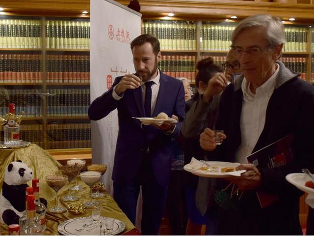 图为外国友人在巴黎文化中心品尝五粮液