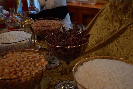 图为五粮液向海外友人展示酿酒所用的五种粮食