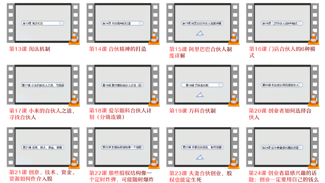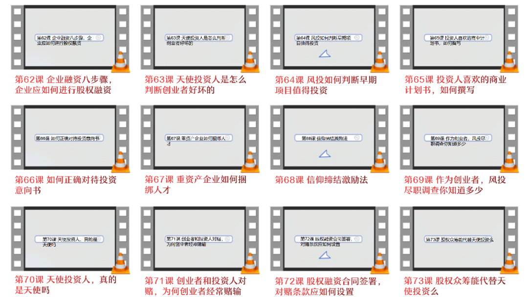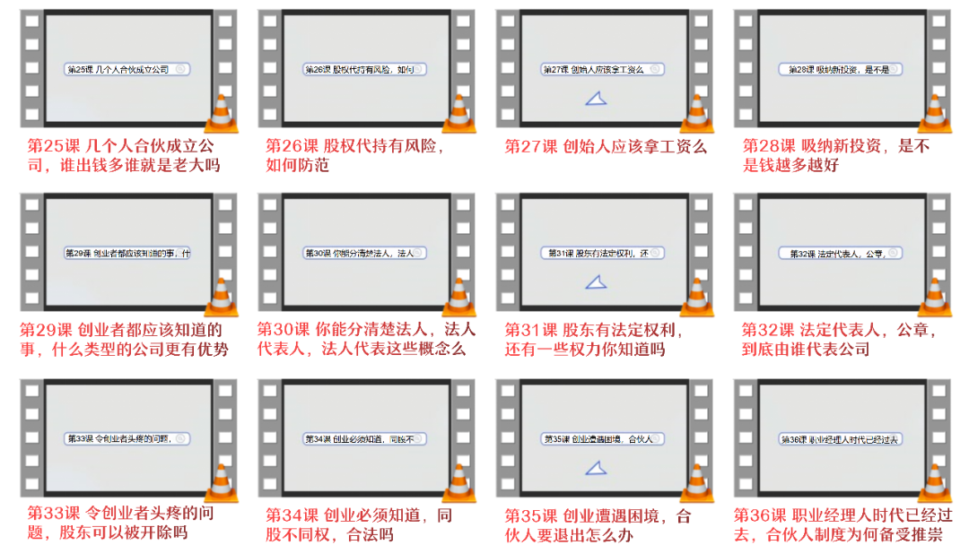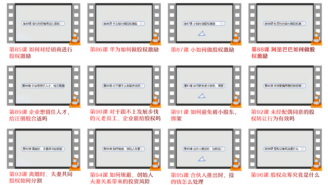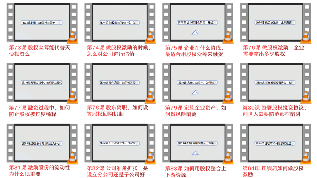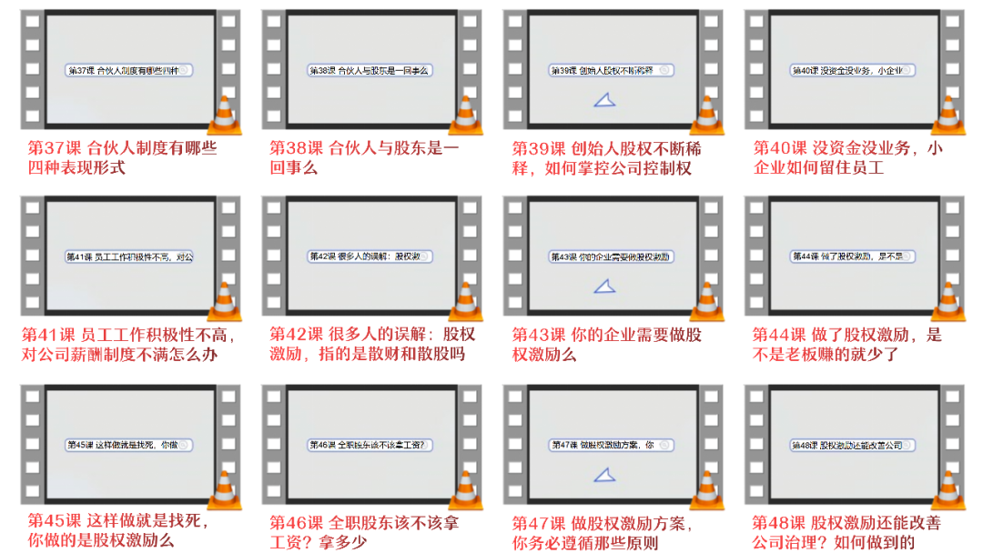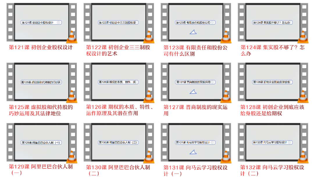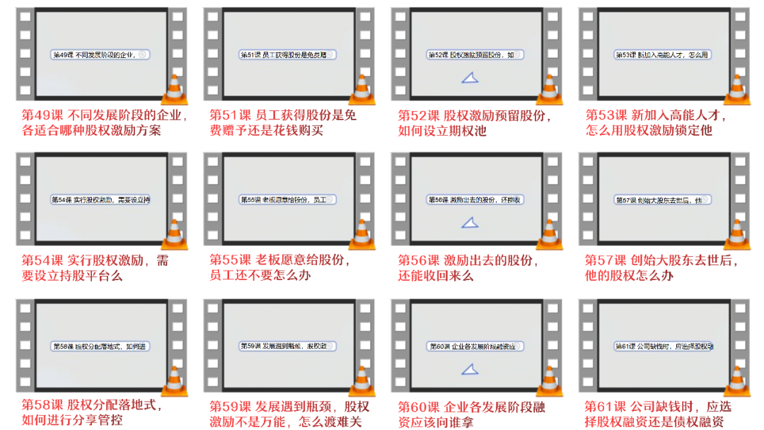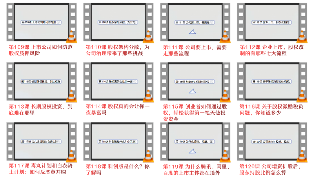 创业想要少走弯路,就要去取经,没有时间去参加线下课程培训吗?不要紧,给您推荐录制视频股权设计课程,156集,从创业期、发展期、扩张期、稳定期、衰退期、上市期等,每一个阶段的股权设计知识点!