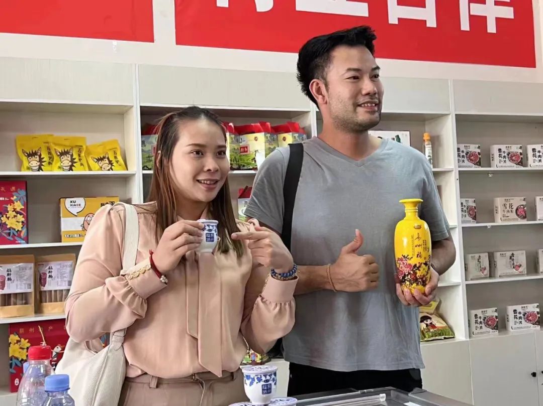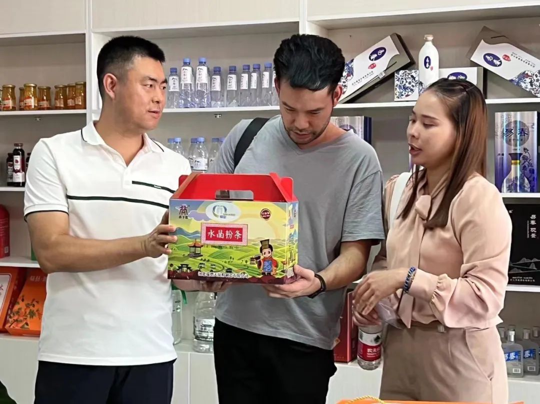 老挝客商在协会展厅对易县特色食品产生浓厚兴趣,对易县地方酒、鹅肠、卤蛋、代餐粉、冰柿、雪花牛肉等特色产品进行了一一品尝和了解,并就合作事宜进行交流探讨。