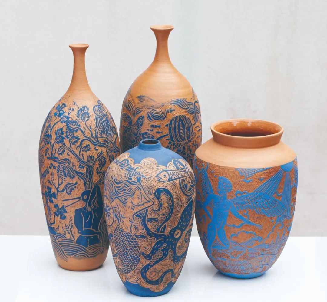Employing a traditional Italian pottery decoration technique called sgraffito, meaning “scratched”, Holt carefully incises shallow cuts out of the smooth surface of a glazed pot, revealing the outlines of figures, animals, plants, and landscapes. In her series Terracotta Blues, the characters exist within an undefined story that circle around tall earthenware vases, creating“dreamlike scenes and imaginary characters that leave room for interpretation.”