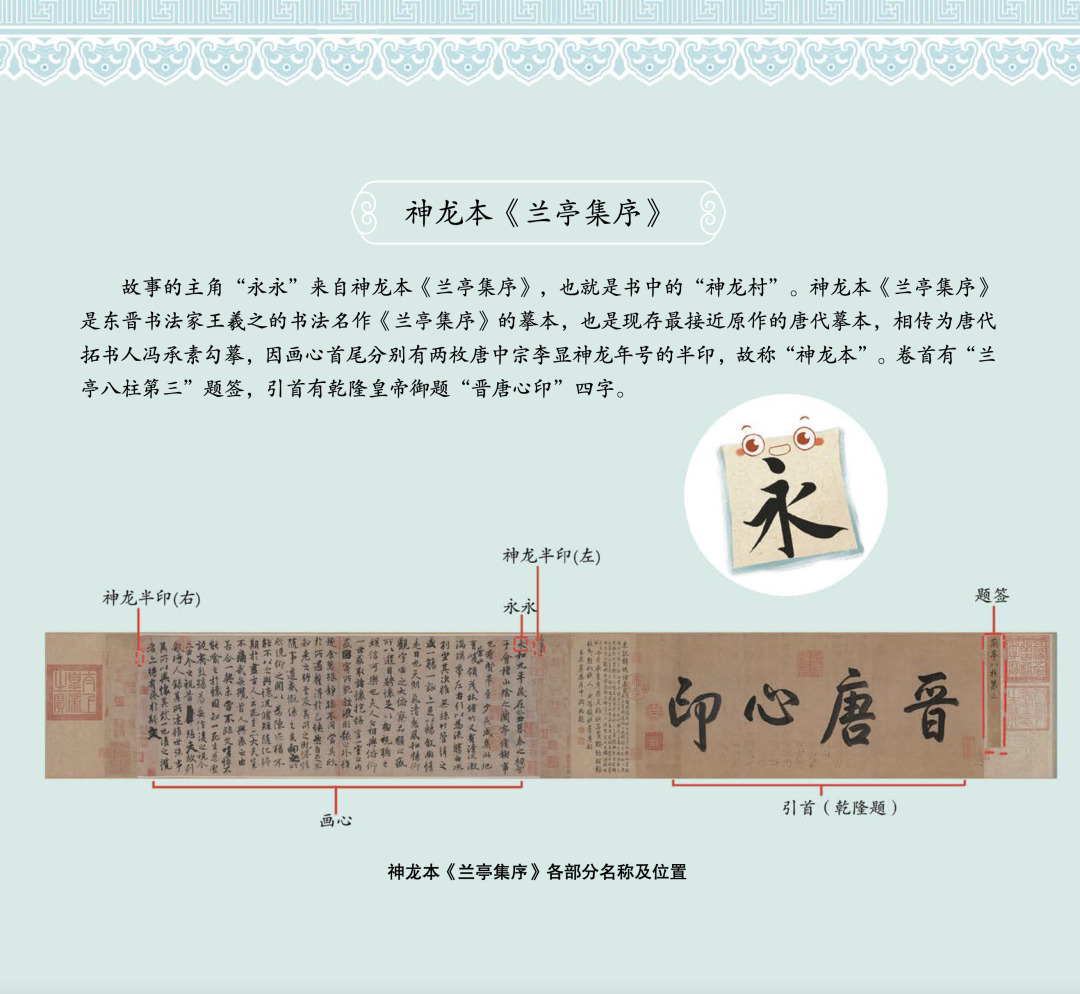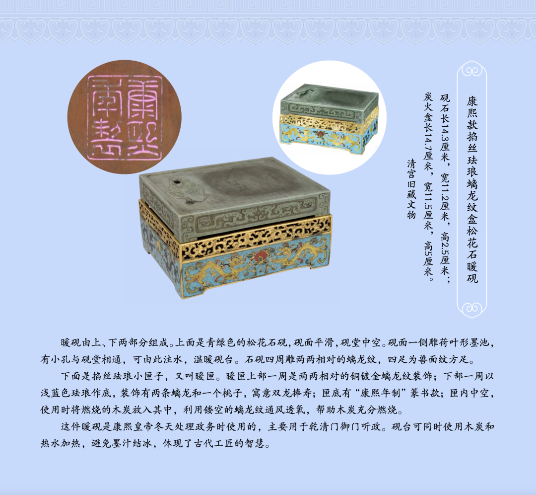 每册都有一个文物小档案,专业解读故宫这些文物的历史、特色、工艺。在这套书里,孩子们可以看到漆盒、埙、石鼓、门枕、镇纸等这些源自古人的杰作,也可以知道《兰亭集序》的由来,石刻文物石鼓历尽颠沛流离最终在故宫博物院安家的经历等。
