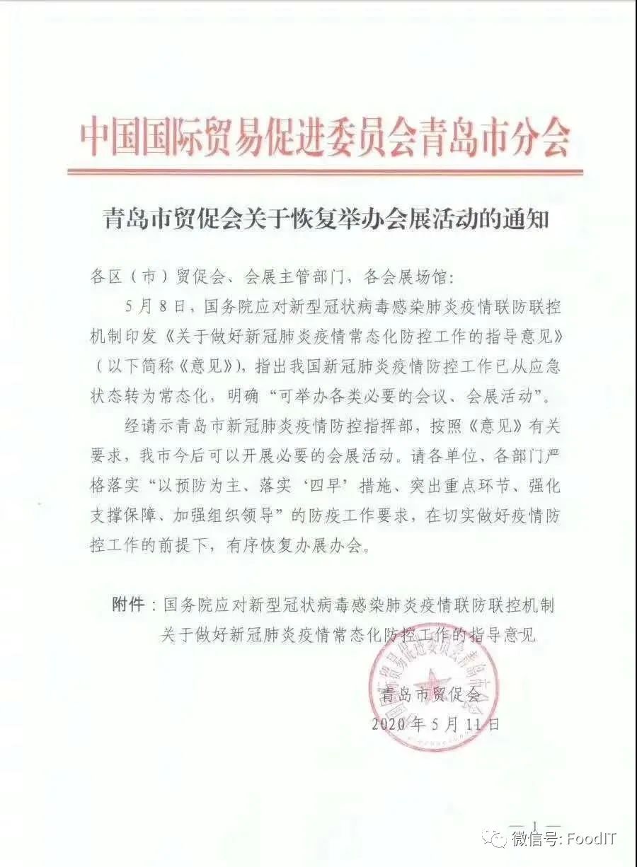 青岛市贸促会于2020年5月11日发布了《关于恢复举办会展活动的通知》,指出:经请示青岛市新冠肺炎疫情防控指挥部,按照5月8日,国务院应对新型冠状病毒感染肺炎疫情联防联控机制印发《关于做好新冠肺炎疫情常态化防控工作的指导意见》有关要求,青岛市今后可以开展必要的会展活动,各单位、各部门严格落实以预防为主、落实“四早”措施、突出重点环节、强化支撑保障等防疫要求,有序恢复办展办会。除政策外,进入五月以来,全国多地也已陆续成功举办展会,包括:2020济南广告展、2020湖南汽车展览会、2020长沙建博会、2020长沙首届婚博会、2020济南安防展、2020第17届海南汽车展览会、2020武汉市农超工贸对接会等。