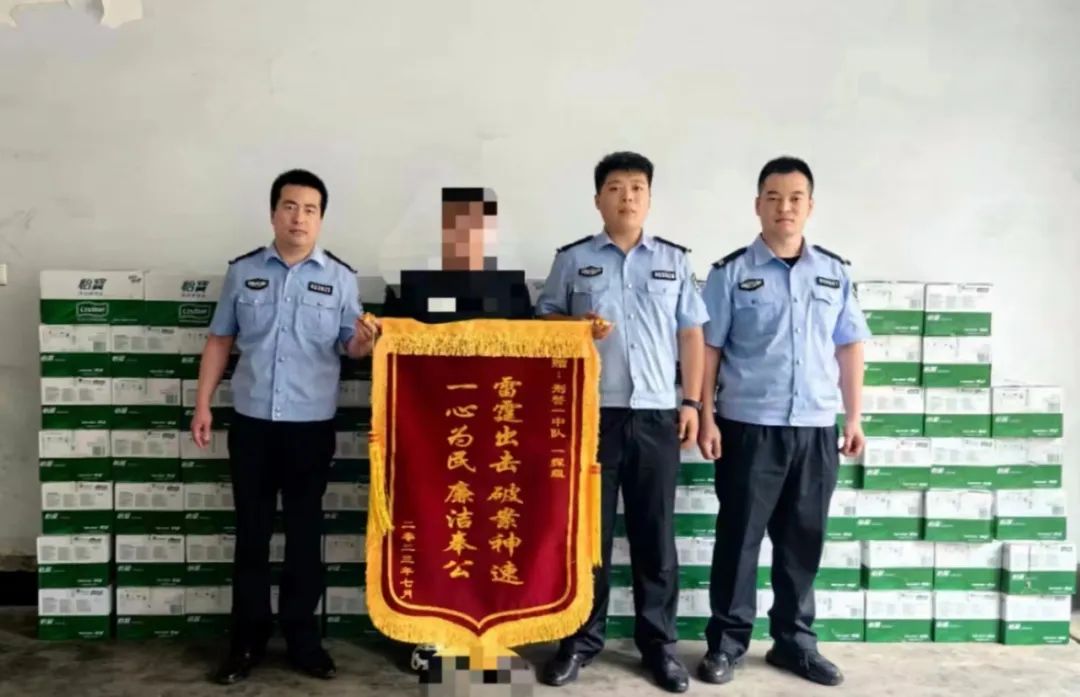 “警察同志,太谢谢你们了……”7月11日上午,群众王某某专程定制了一面绣有“雷霆出击破案神速 一心为民廉洁奉公”的锦旗,送到办案民警手中,对公安民警及时破案追赃,为其挽回损失表示了感谢。
