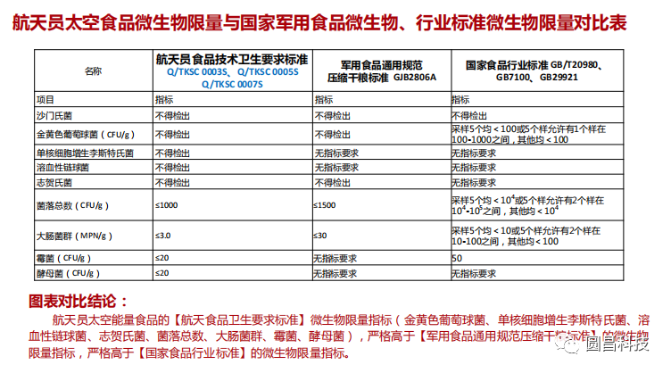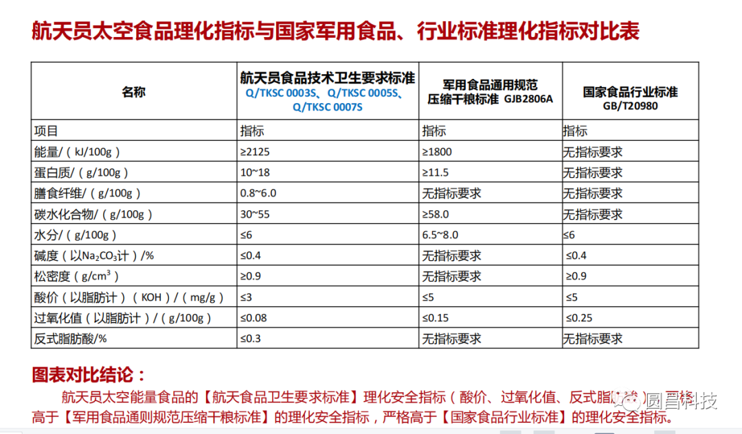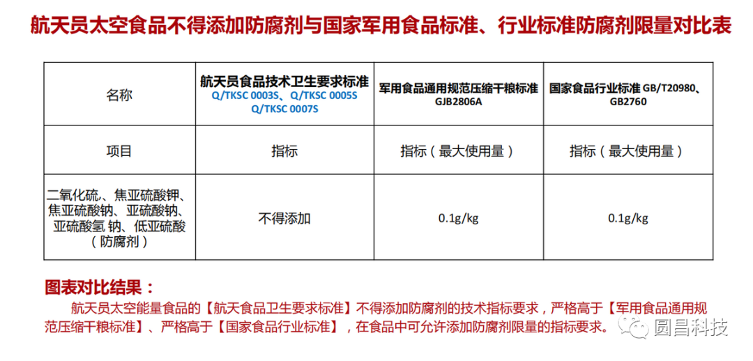 图上可以看出航天员太空能量食品的【航天食品卫生要求标准】不得添加防腐剂的技术指标要求,严格高于【军用食品通用规 范压缩干粮标准】、严格高于【国家食品行业标准】,在食品中可允许添加防腐剂限量的指标要求。