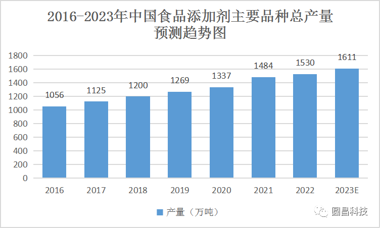 据中国食品网的数据显示就2016年——2023年中国食品添加剂总产量都在不断提升。从16年的1056万吨涨至2023年的1611万吨。