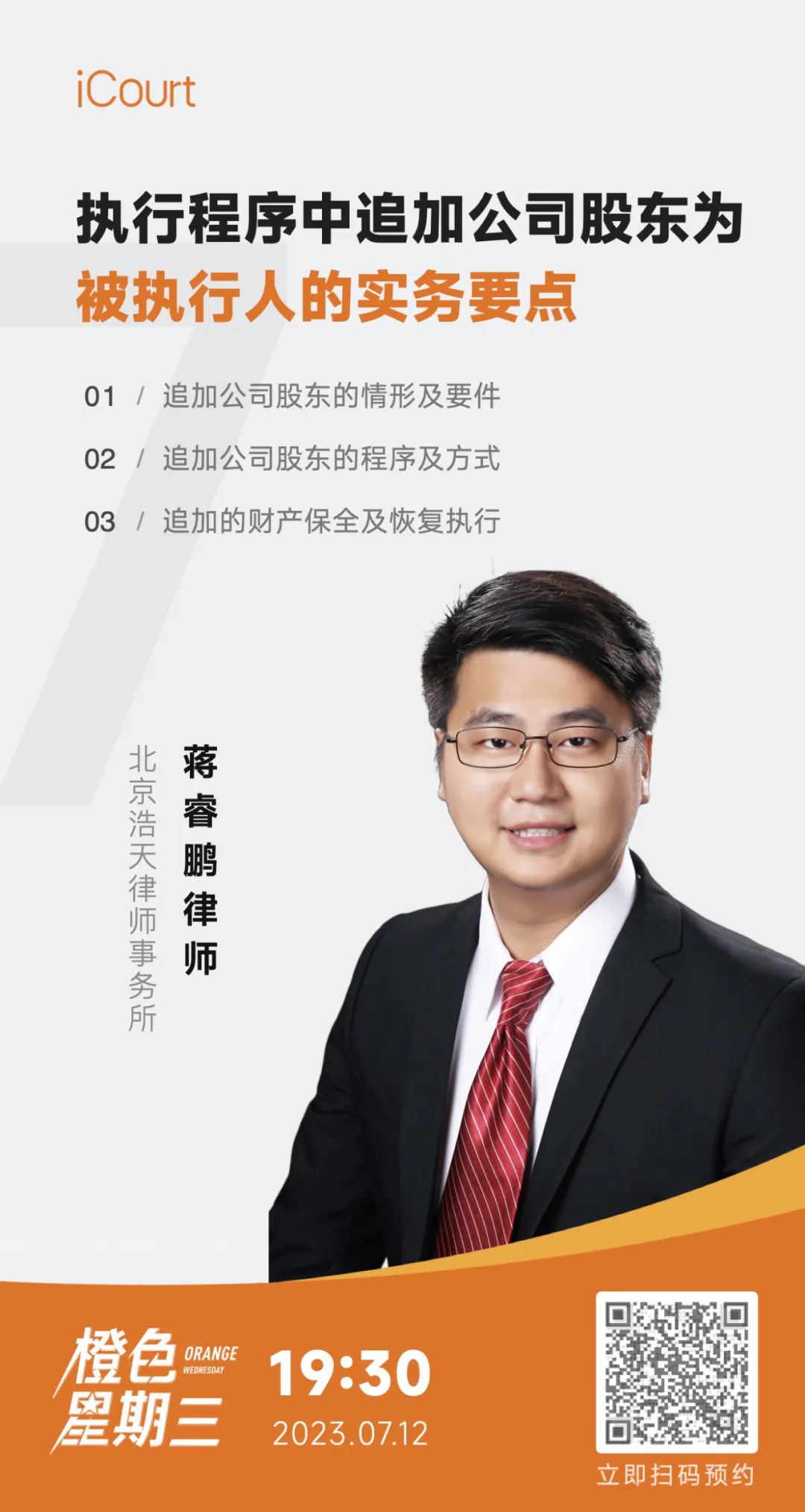 本期直播课,特别邀请到了北京浩天律师事务所蒋睿鹏律师,为大家带来『执行程序中追加公司股东为被执行人的实务要点』,点击下方预约按钮,答案今晚为您揭晓。