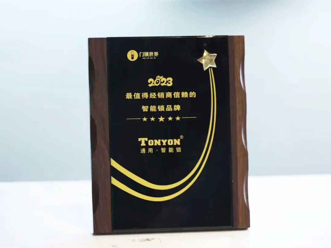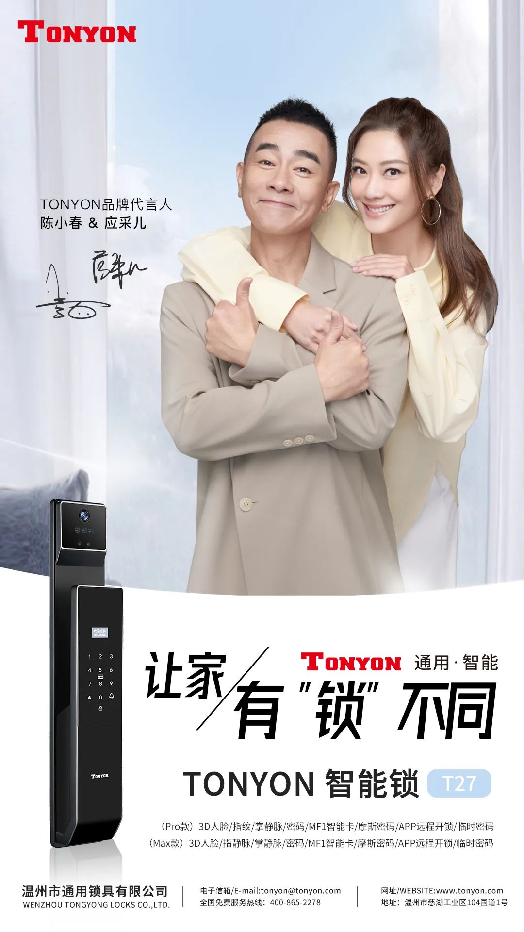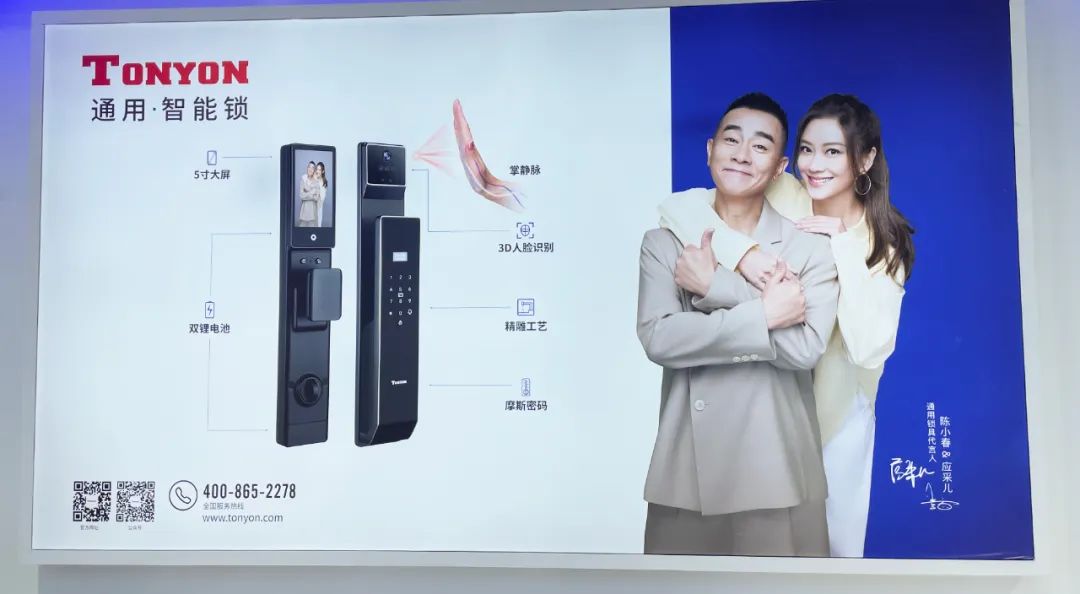 除了丰富、优质的产品之外,TONYON通用还推出了免押金代理支持、广告支持、代理商促销支持、市场窜货控价政策、首次进货支持及售后服务支持六大经销商扶持政策,给合作伙伴以信心。TONYON通用的实力,不仅获得现场业内外人士的认可,还获得行业权威结构的认证。在2023第四届中国(广州)智能锁行业峰会暨2023第三届中国(广州)门·锁融合发展论坛上,TONYON智能锁获得“2023最值得经销商信赖的智能锁品牌”荣誉称号。资深锁具从业者,对TONYON通用品牌一定不陌生,其从事锁具制造已经有三十余年,积累了丰富的经验,因此,我们有机会看到摩斯机械密码这种具有颠覆性的产品出现。近年来,TONYON通用积极探索新的发展方向,依托其对锁具的深刻理解,和国内锁具智能化趋势,TONYON通用开始入局智能锁。在入局之后,TONYON通用也进行了众多动作,例如除了以上提到的丰富产品线和针对线下渠道推出的扶商之外,TONYON通用已经开通了天猫、京东等线上渠道,通过网络快速传播品牌知名度。更值得关注的是,在去年12月,TONYON通用官宣代言人陈小春夫妇,开启了品牌代言发展之路。