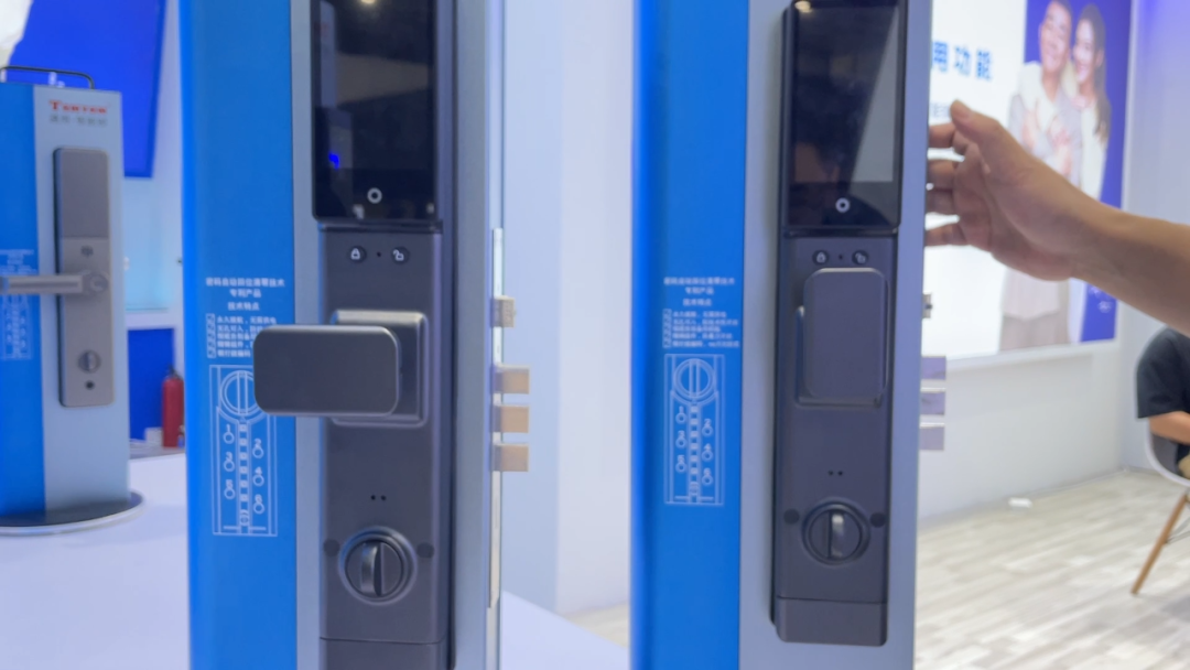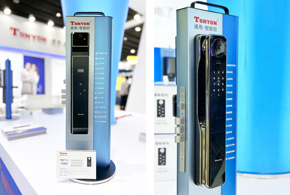 今年以来,搭载掌静脉的智能锁迅速成为热门赛道,许多品牌陆续推出了相关新品。在TONYON通用的展馆,我们也见到了其推出的掌静脉智能锁T27 和T28。TONYON T27和T28在功能配置方面有许多相似之处,例如3D人脸、掌静脉识别、5英寸室内屏、远程可视对讲等等。而在外观结构方面,T27和T28区别明显。T27采用推拉式结构设计,产品外观棱角分明,彰显硬派风格。前面板经过哑光处理,十分内敛,让产品格调明显提升。T28采用双层大拉手设计,外观偏圆润,优秀的表面处理工艺,让产品手感非常丝滑,握持触感细腻。