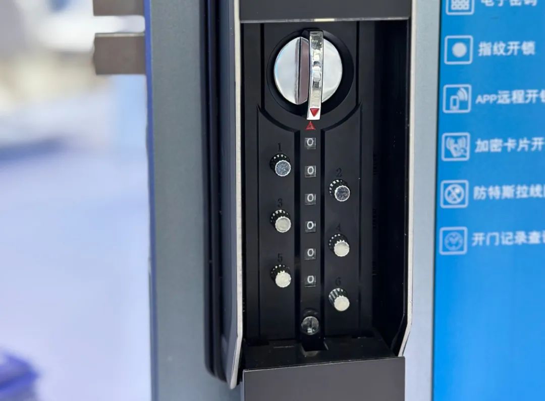 在经过实地近距离的产品使用之后,我们发现了产品的一些亮点。生物识别方面,T27和T28主打掌静脉和3D人脸识别解锁。其中,掌静脉是一种通过红外线照射手掌内部静脉,进行身份验证的生物识别方式。掌静脉相比业内主流的指纹、人脸识别,更具有隐蔽性,极难被窃取;实用性方面,掌静脉的识别方式不仅适合成人,对于身高较矮的儿童、指纹不清晰的老人也非常友好。在智能锁相关标准中,规定了智能锁要有应急开锁方案,目前业内主要采用机械钥匙方案。TONYON通用则是结合自身在锁具制造方面的经验,推出了摩斯机械密码,并普及到了旗下绝大部分智能锁上,包括T27和T28。据现场工作人员介绍,摩斯密码开锁方式,可以解决用户忘带钥匙、智能锁没电等情况下的开锁难题。其使用方式非常简单,只需要拨动齿轮使数字转到正确位置,然后旋转内部的开关即可。在展馆现场,工作人员以T29智能锁的摩斯密码为例,实际演示了一遍。▲T29摩斯密码智能锁应急开锁演示
