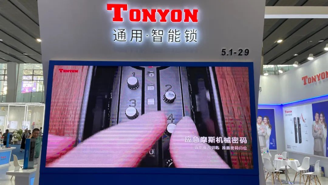 一年一度的广州建博会正式结束。在此次展会上,许多智能锁品牌携新品亮相,同时,也出现了许多新的技术,让人眼前一亮。作为有着30多年制锁工艺的老牌锁企,TONYON通用资本雄厚,锁具制造专业技术过硬。近年来,TONYON开始布局智能锁,也推出了许多产品。相信很多人都好奇,其产品究竟怎么样?今年又有哪些新品?本次建博会,智能门锁研究Pro实地走访了TONYON通用展厅,为你带来一手信息。开放展馆,LCD大屏