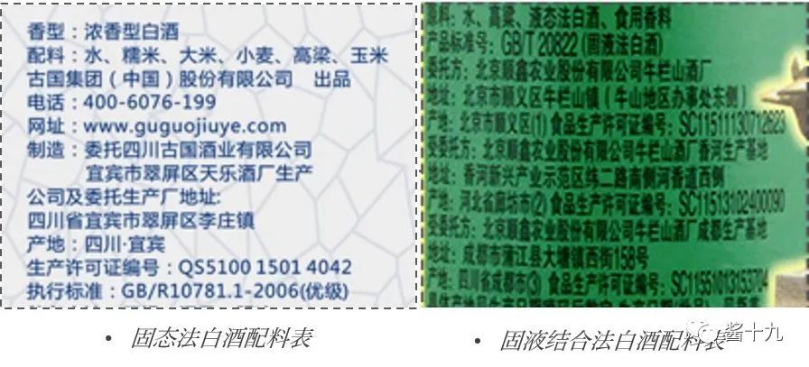 酒标中的生产日期一般会标注为:生产日期,见某处。一般情况下瓶盖、盒身和盒顶是白酒生产日期的常见位置。白酒的生产日期并不是酿造日期或窖藏日期,而是产品灌装入瓶或包装入盒的时间。同时,生产日期的字符串也是很多酒厂的重要防伪手段。配料清单中各种配料按照生产加工食品时加入量的递减顺序进行标注。所以看配料清单的时候,越靠前的东西是加入量越多的。《预包装饮料酒标签通则》(GB 10344-2005)、《食品安全国家标准-蒸馏酒及其配制酒》(GB 2757-2012)等标准规定:液态法白酒的配料表必须标注食用酒精、水和使用的食品添加剂,不得标注原料为高粱、小麦等。以固液结合法白酒(固态法白酒不低于30%)其配料表必须标注使用的液态法白酒或食用酒精等内容,不能仅标注为高粱、小麦等。通过配料也可以辨别一些骗术低下的假酒,比如说某些假酒标注自己是酱香型,配料中却标注高粱、豌豆、水。