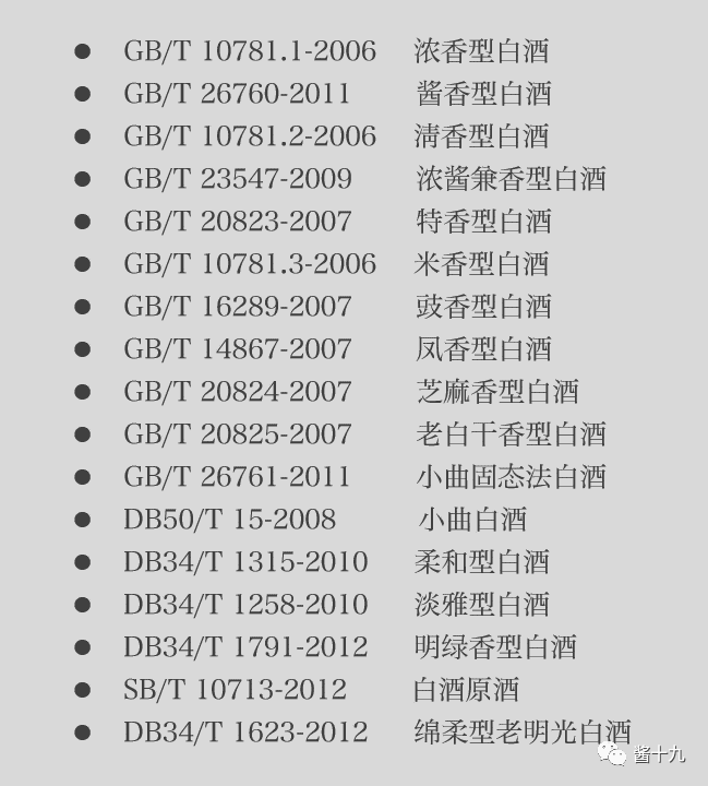 白酒产品是实施生产许可证管理的食品,必须要标注QS标志及其编号。白酒的产品标准可分为:国家标准、行业标准、地方标准或者是经过备案的企业标准的编号。如:浓香型白酒的产品标准代号为GB/T10781.1,淡雅型白酒的产品标准代号DB34/T 1258-2010。GB为“国标”首字母缩写,DB为“地标”首字母缩写,34代表安徽省。茅台酒的产品标准为GB/T 18356,与其他酱酒企业的GB/T 26760有所不同,这是茅台酒厂的企业标准经过认证,进而成为国家标准。如果执行的产品标准中有明确要求必须标注质量等级,一般会在执行标准代码标注表示质量等级的字样。白酒质量等级分为优级、一级、二级3个级别,优级>一级>二级,其差异主要表现在香味成分的含量上。有些酒在质量等级上会标注“特级”,这样的酒80%是未经过质监部门检验的产品。