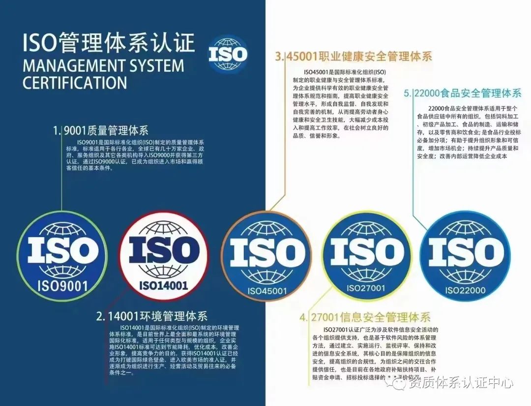 每个行业都有适合自身情况的认证清单,ISO22000和HACCP就是对食品行业有指导效果的体系标准;ISO三体系认证和ISO28000适用性较广泛,同样适合于其他行业有相关业务内容的企业申请。