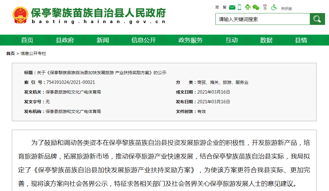 《保亭黎族苗族自治县加快发展旅游产业扶持奖励方案》
