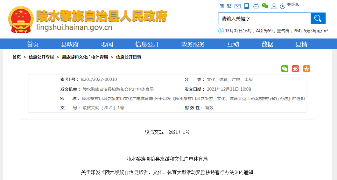 《陵水黎族自治县旅游、文化、体育大型活动奖励扶持暂行办法》