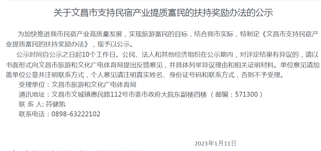文昌市支持民宿产业提质富民的扶持奖励办法