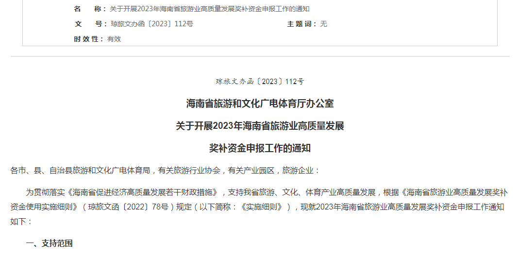 关于开展2023年海南省旅游业高质量发展奖补资金申报工作的通知