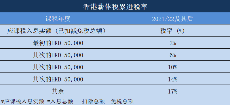 在香港,薪俸税存在着标准税率和累进税率两种计算方式。标准税率为15%,累进税率分五级,每级税率分别为2%、6%、10%、14%、17%,税务局会选择较低的税款额来征收薪俸税。通常标准税率更适合高收入人士,而累进税率更适合中等和低收入人士。