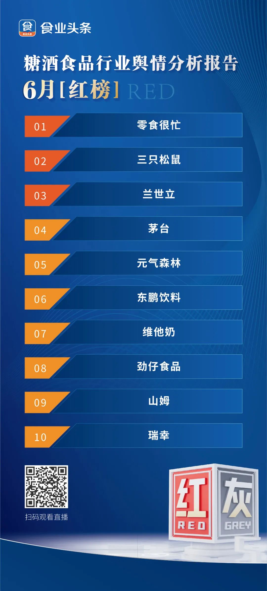 一段舆论在网络发酵,可以让品牌瞬间集齐“万千宠爱”,也能够迅速导致信任危机。在这样的网络环境下,糖酒食品厂商更应以舆情为镜,时刻关注行业风向。6月,我们以食业头条APP为数据基础产出“红榜”和“灰榜”,并对榜单进行了解读——*红榜:振奋人心,社会反响良好,或者直观反映增长以及带来增长启示截至2023年6月25日,零食很忙全国门店总数已突破3000家。仅2023年上半年,品牌新增门店数超1000家,并正以“平均每天新开6家门店”的速度,继续保持高速且稳健的拓展。面对品牌当下的高速扩张,零食很忙相关负责人表示,“零食很忙的扩展,门店标准化复制模式已经相当成熟,相比于每年近4万批次的加盟意向咨询总量,这种速度仍然是高标准下的克制”。零食很忙突破3000家店的背后,我们不仅可以看到其超快的发展速度,也能看到其模式的优越性。作为主打下沉市场的零食集合店,这些年来,零食很忙发展速度十分惊人。深度分析,其门店数量的突破性增长与品牌坚持全国化发展的战略密切相关。数据显示,2022年零食很忙实现湖南省14个地州市全覆盖,并下沉到县城、乡镇市场,在湖南形成了“单省千店”的稳固基本盘后,开始拓展江西、湖北市场。2023年以来,零食很忙进驻广西、广东、贵州等,并将目光瞄准河南、重庆、四川、云南等省份。另外,零食很忙的快速扩张也侧面反映了零食连锁业态的火爆。据不完全统计,上半年,已有6家零食品牌拿到融资或IPO,对比去年同期的4家有所上涨。而去年一整年共发生11起投融资事件。除了资本的看中,进入零食连锁赛道的玩家也越来越多,越来越卷。一类是原本扎根下沉市场的地域龙头,比如零食很忙、糖巢、赵一鸣零食、零食有鸣等,不断加速拓店,谋求成为跨地域布局的全国性品牌。一类是好想来、好幸福、戴永红等相对体量较小的中型零食量贩店也在不断扩张。根据光大证券的研报,截至2023年2月,这些中型品牌的门店规模均已超过500家。另外,还有一类就是零食巨头的跟进。去年底,良品铺子推出了主打下沉市场的零食量贩店“零食顽家”,以“便宜才是硬道理”为口号,聚焦良品铺子的大本营湖北开店。在良品铺子2023年新开千店的规划中,很大一部分都是由新品牌“零食顽家”来承担。今年以来,三只松鼠一边大量关停早期推出的直营投食店和联盟小店,另一边推出主打下沉市场、量贩模式的自有品牌社区零食店,今年6月,三只松鼠10家社区零食店同时开业,选址均在芜湖、马鞍山、宣城、滁州、亳州及江苏盐城等三线及以下城市。然而,不断开店的同时,也有零食店出现暴雷甚至退出市场。比如“老婆大人”传出倒闭的消息,a1零食研究所被爆出“已关闭80%的门店”的消息等。这冰火两重天的背后,也意味着零食连锁赛道正在不断洗牌,一方面,零食集合店入局者众多,要突围,就必须树立独有的优势,走差异化的路线;另一方面,要紧跟行业趋势,不断迭代,孵化出更适合市场的模式。6月7日,三只松鼠在业绩说明会上表示,公司门店业务将基于“全国化品牌、核心品类自有供应链以及全品类拓展经验”的优势,探索并落地一批定位于自有品牌的社区零食店,从而为每个家庭提供全品类的高端性价比坚果与健康零食。首店于6月1日开启内测,6月18日又有10店同开,主要分布在安徽、江苏两地,截至目前,三只松鼠已开设17家社区零食店。2016年,三只松鼠自营的投食店开业;2018年,三只松鼠推出联盟小店的加盟业务。但这两项业务基本上都宣告失败了,三只松鼠在2023年再次试水社区零食店,并且是章燎原亲自带队的“一把手工程”,接驳时下流行的量贩零食商业模式。值得一提的是,在“性价比”的底层逻辑下,三只松鼠的打法还有很多“特立独行”的设计,比如坚持自有品牌,除了一些水饮产品,剩余500多个SKU全部是三只松鼠品牌,这在一定程度上限制了商品数量,对比头部量贩零食店动辄1000以上的SKU规模,这属实有点少。但是全部自有品牌的好处是统一的视觉调性和品质保证,这某种程度上也是三只松鼠底气的呈现;然后是不办卡,不储值,直接享受低价,把购物流程最简化;散称去皮称重,包括包装袋、脱氧剂、酒精片、内托的重量都会去掉,消费者只为食品本身买单;标准包装产品使用300g、500g等整数规格,消费者可以轻松换算;三只松鼠还喊出了“口味不满意全额退款”的口号,很有胖东来的一些神韵……这些细节的设计,对拉取消费者好感度是非常有效果的。最后再看看三只松鼠社区零食店的实战成绩怎么样:根据品牌官方发布的数据,三只松鼠金鹰店正式营业11天销售额超过85万元,到店人流量5万+;中央城店内测5天销售额超过11万元,客流量破万……短期数据还不错,那从长期看,我们认为,三只松鼠的社区零食店如果可以把SKU的数量拉升到1000以上,给到消费者更丰富的选择,抢下一块阵地不是难事。现在头部梯队至少是千店规模,零食很忙甚至已经超过3000家门店,三只松鼠能不能后来居上,我们很期待看到未来的“江湖洗牌战”。