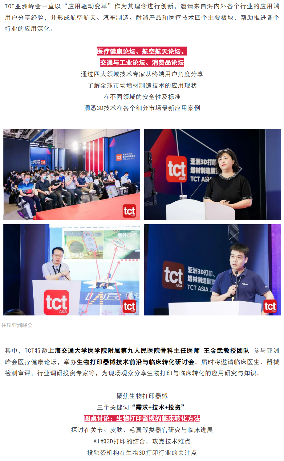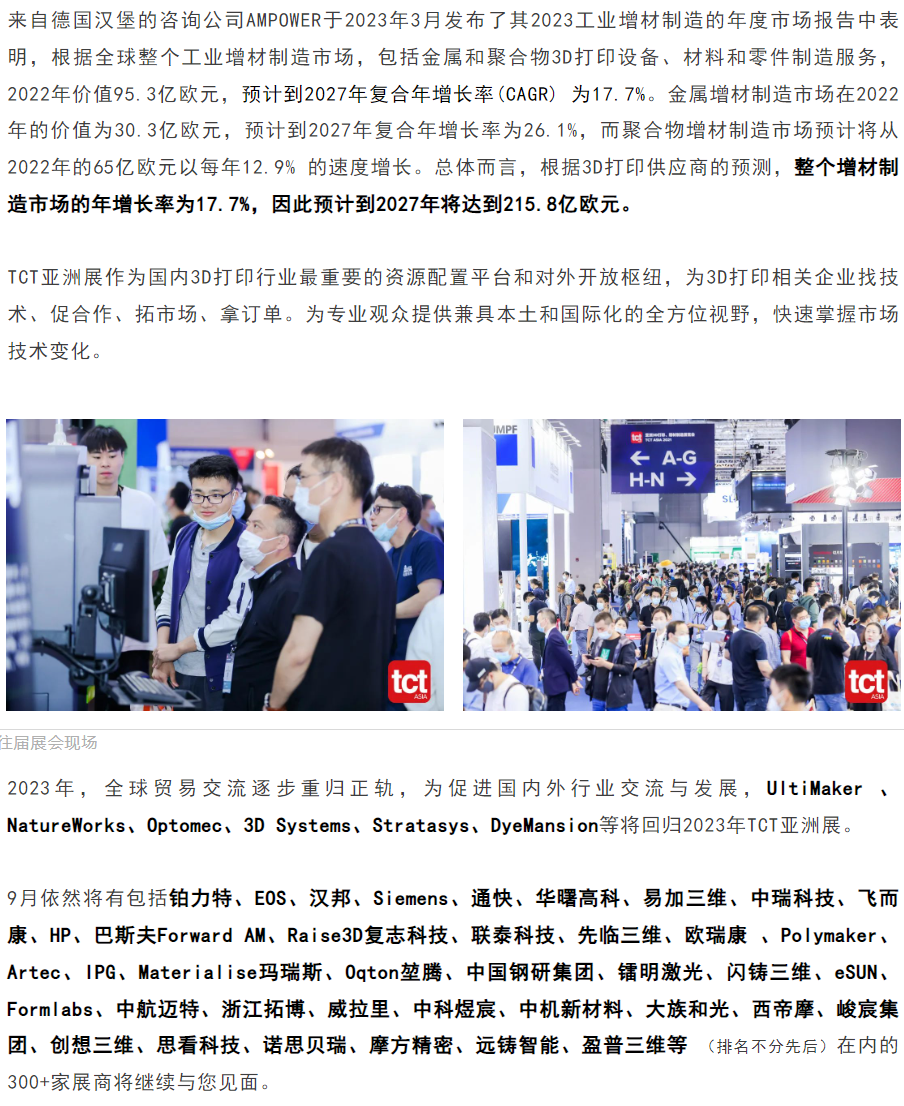 TCT亚洲展源自英国,2015年进入中国。TCT亚洲展是亚洲地区专业的3D打印技术展览会。作为TCT品牌全球巡展的重要一环,TCT亚洲展的使命不止于简单传播3D打印知识,而是从设计到生产制造的整个工艺流程中,发掘出增材制造技术100%的潜力。