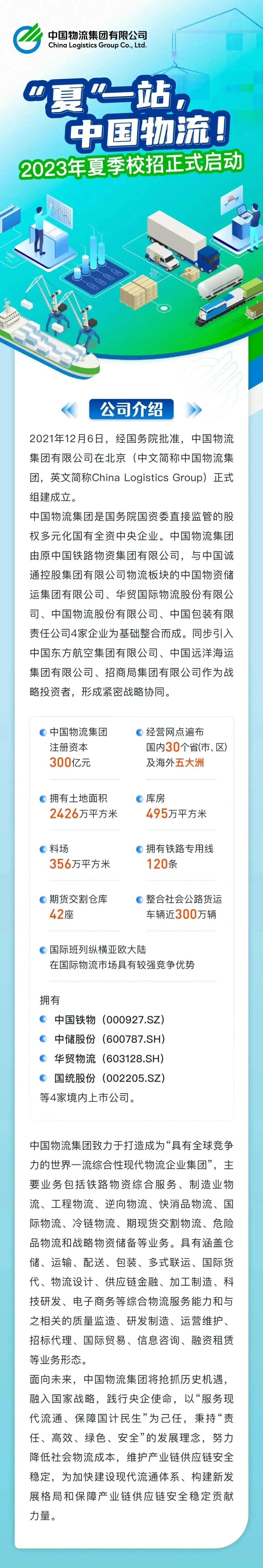 2021年12月6日,经国务院批准,中国物流集团有限公司在北京(中文简称中国物流集团,英文简称China Logistics Group) 正式组建成立。中国物流集团是国务院国资委直接监管的股权多元化国有全资中央企业。中国物流集团由原中国铁路物资集团有限公司,与中国诚通控股集团有限公司物流板块的中国物资储运集团有限公司、华贸国际物流股份有限公司、中国物流股份有限公司、中国包装有限责任公司4家企业为基础整合而成。同步引入中国东方航空集团有限公司、中国远洋海运集团有限公司、招商局集团有限公司作为战略投资者,形成紧密战略协同。