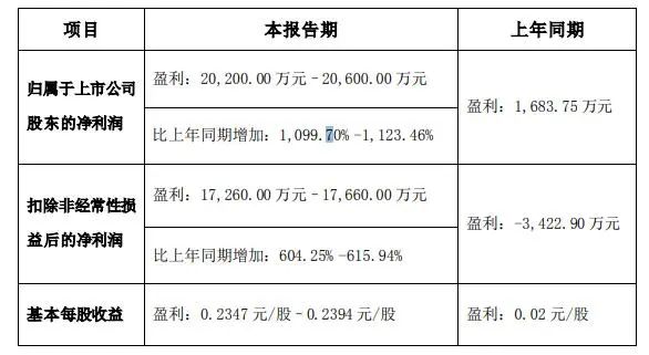 扣除非经常性损益后的净利润预计为1.73亿元-1.77亿元,同比增长604.25%-615.94%;基本每股收益0.2347元-0.2394元。