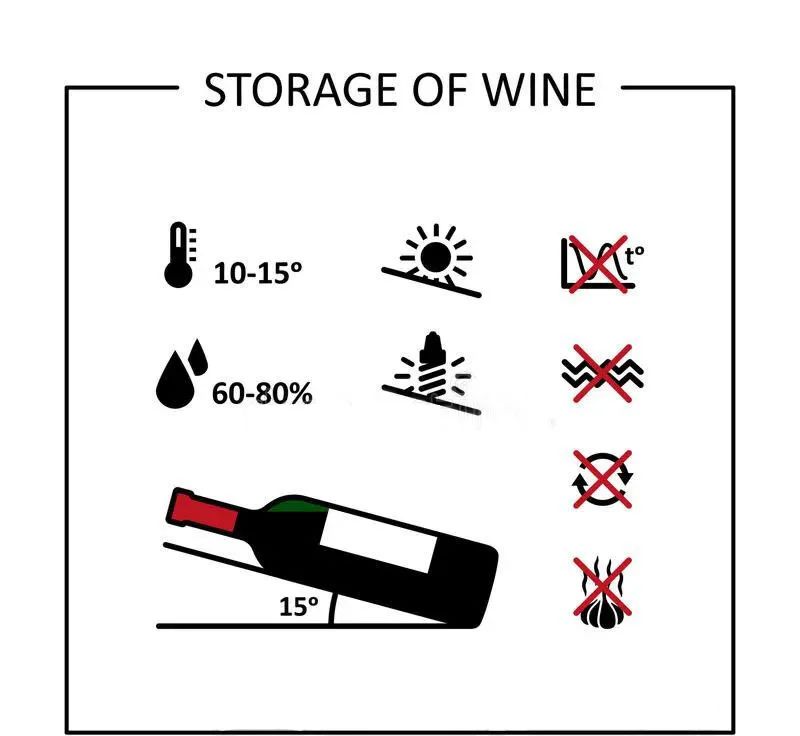 ·保持一定的湿度和卧放可以避免橡木塞因失水而干瘪收缩。湿度被控制在70%的凉爽环境是最佳的,过高的湿度会令软木塞滋生细菌。(螺旋盖、合成塞封装的葡萄酒,短期内要饮用的软木塞封装的葡萄酒,则可以直立,无需平放。)