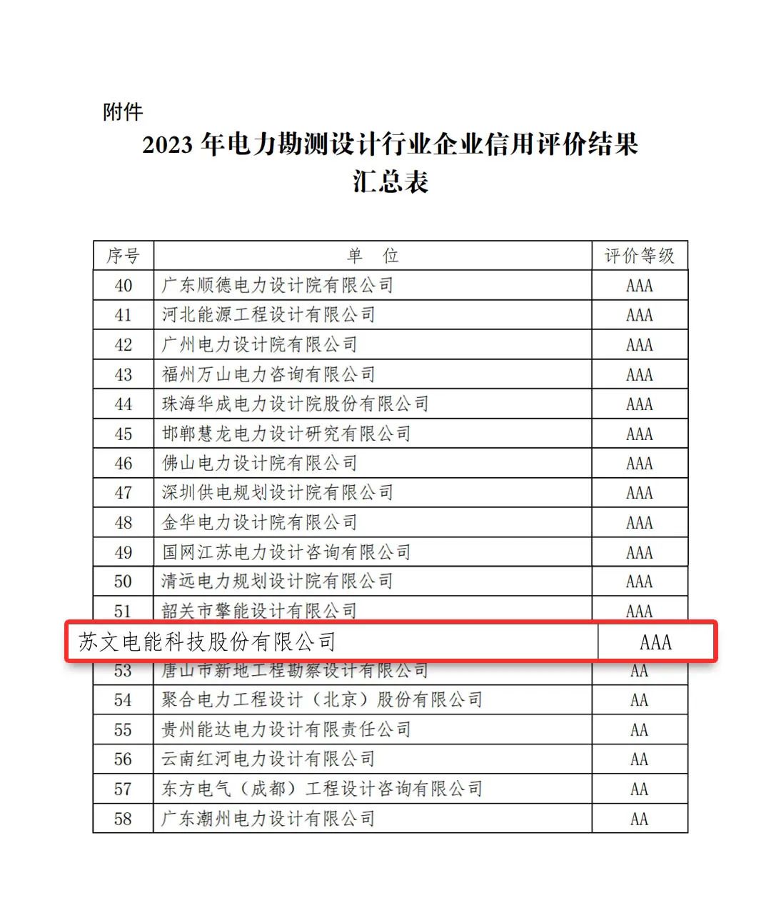 苏文电能科技股份有限公司荣获2023年电力勘测设计行业企业信用评价“AAA评价等级”。