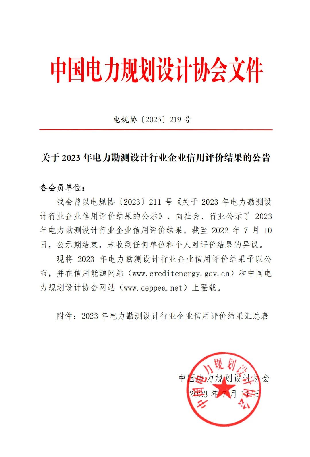7月11日,中国电力规划设计协会公示2023年电力勘测设计行业企业信用评价结果。
