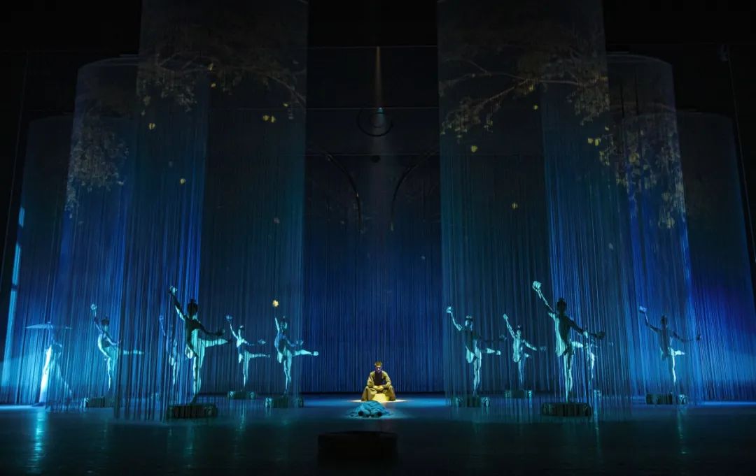 芭蕾舞剧《白蛇传》整合了科艺媒介手段,融合艺术要素与技术要素,运用多媒体布景技术,将千年时光压缩在一方舞台上;建立空间的虚实感和氛围感,在景观中凸显奇幻与真实,在虚实相生中呈现人的认知变迁与代际进化,渐渐窥探出剧目的深意。