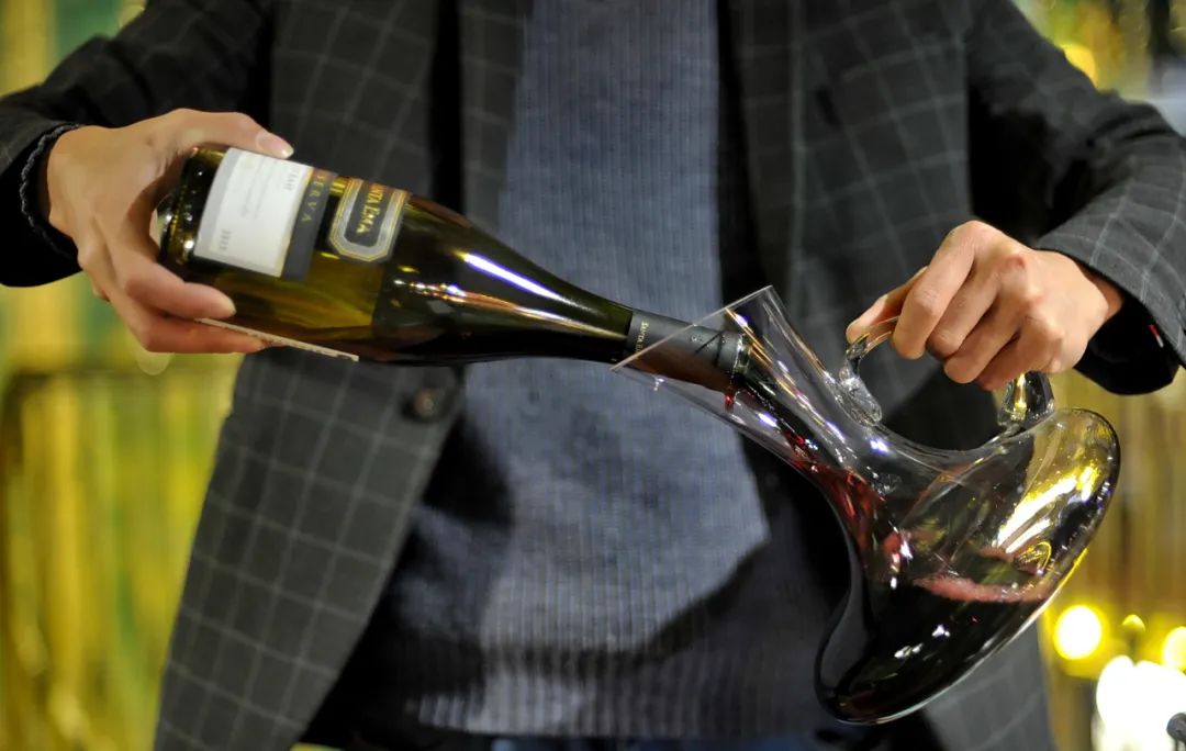 3. 将葡萄酒从瓶中缓缓倒入干净的容器(通常是细口的醒酒器)中。这个过程需在光源下进行,一手拿酒瓶,另一只手拿着醒酒器,缓慢倒之,直至看到瓶颈处有沉淀出现,便停止倒酒。