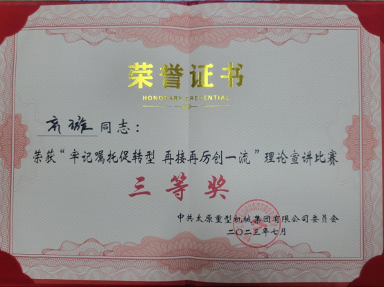 7月13日,由太重集团党委宣传部主办的“牢记嘱托促转型 再接再厉创一流”理论宣讲比赛圆满落幕,经过激烈的角逐,工程机械公司员工齐璇以出色表现荣获比赛三等奖!