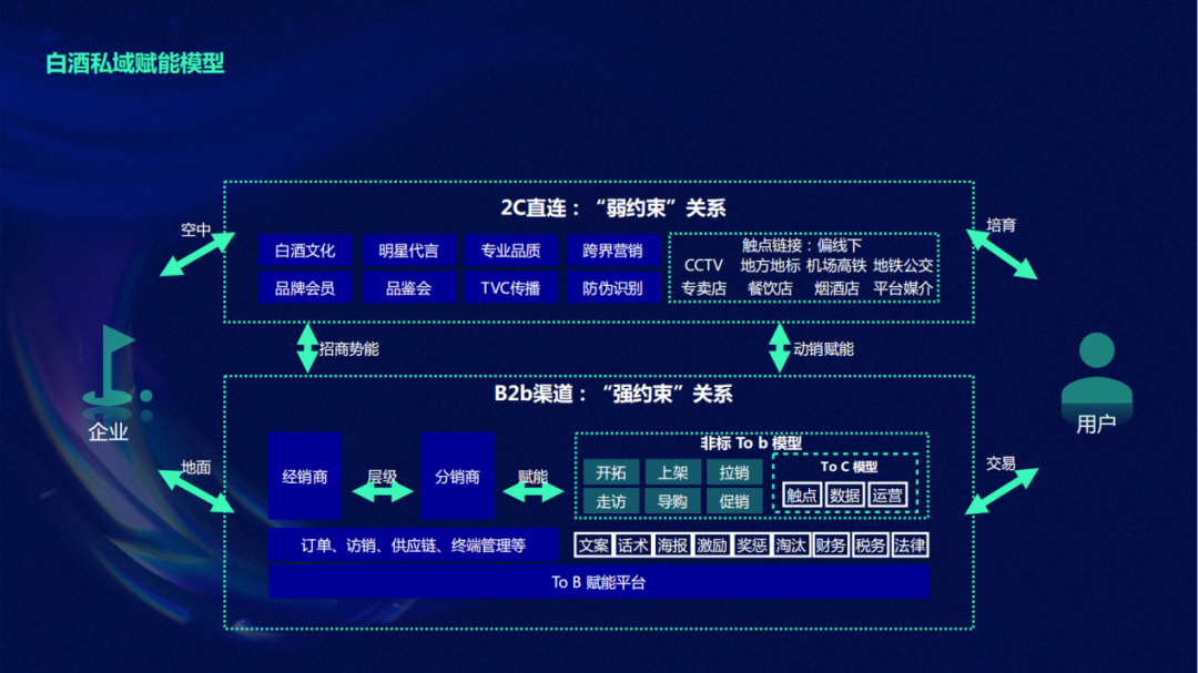 第二种路径,走B2b的赋能路线,企业设计整个的私域的体系,帮助渠道做生意。这个时候私域模式的设计,与第一种路径是大不相同的。企业需要考虑做好内容和活动,去激发渠道的交易;同时为终端制定话术、提供数字化工具等方式进行ToB赋能平台的搭设。这种模式往往在高客单价的传统行业中更为普遍,因为这些企业难以去改造原有的结构。