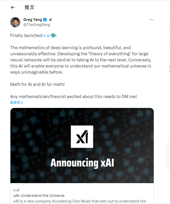 x.AI的联合创始人,华裔杨格(Greg Yang)刚刚也在twitter宣布了这一消息。